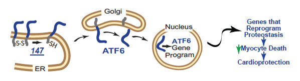 Pharmacologic activation of stress-responsive signaling pathways provides a promising approach for ameliorating imbalances in proteostasis associated with diverse diseases. However, this approach has not been employed in vivo. In recent research done in the Glembotski lab, we used a mouse model of myocardial ischemia/reperfusion to show that selective pharmacologic activation of the ATF6 arm of the unfolded protein response (UPR) during reperfusion with a new drug candidate we discovered in collaboration with scientists at The Scripps Research Institute, code named 147, transcriptionally reprogrammed proteostasis, ameliorated damage and preserved heart function in mice.